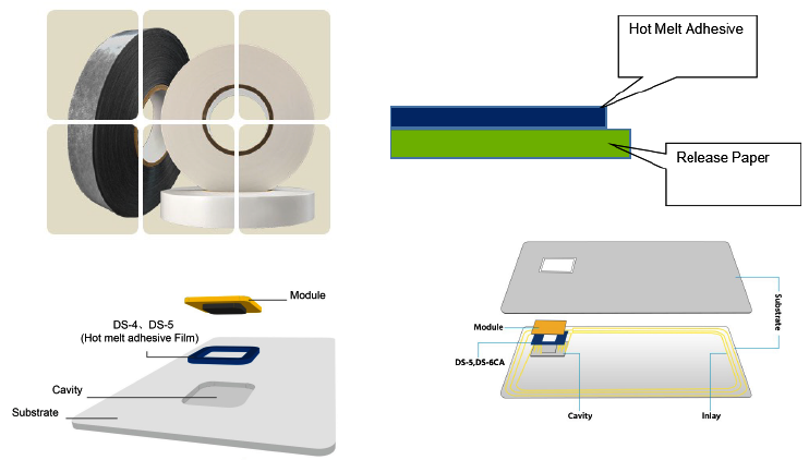 Для имплантации в карты электронных микросхем (чипов с контактными площадками), называемых также чип-модулями, используются ленты с трансферным термоплавким адгезивным слоем. Этот термоактивный клей применяется для фиксации модулей в кавитетах смарт-карт с контактным или дуальным интерфейсом. Клей поставляется на ленте-лайнере, с которой он термотрансферным методом сначала переносится на ленту с чип-модулями. Затем модули с нанесенным клеем, после вырубки имплантируются в кавитеты, и фиксируются термокомпрессионным способом.